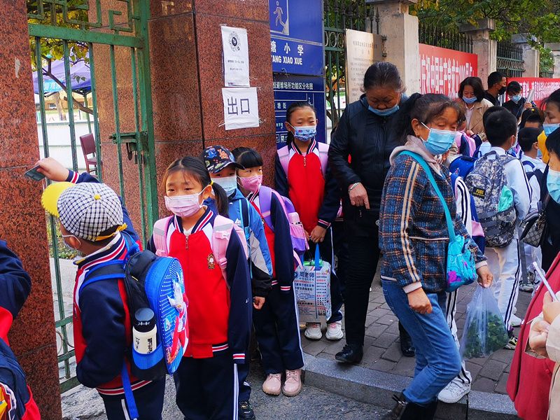 2021年10月8日,哈尔滨市新华小学,老师们有序组织学生进入校园,并对每位学生进行体温检测。