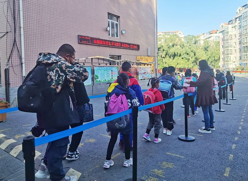 2021年10月8日,哈尔滨市钱塘小学校,学生排队等候体温检测。