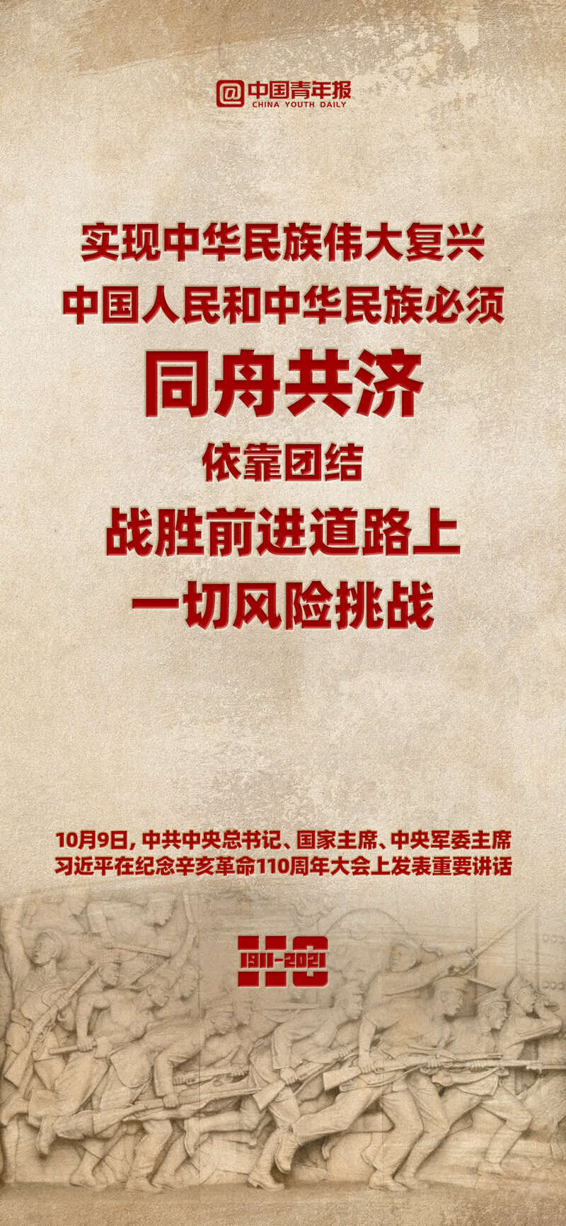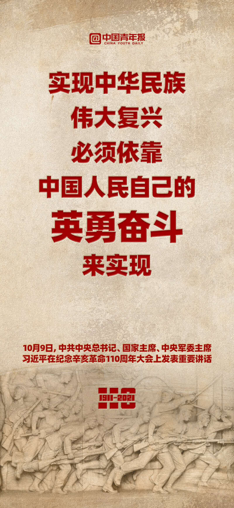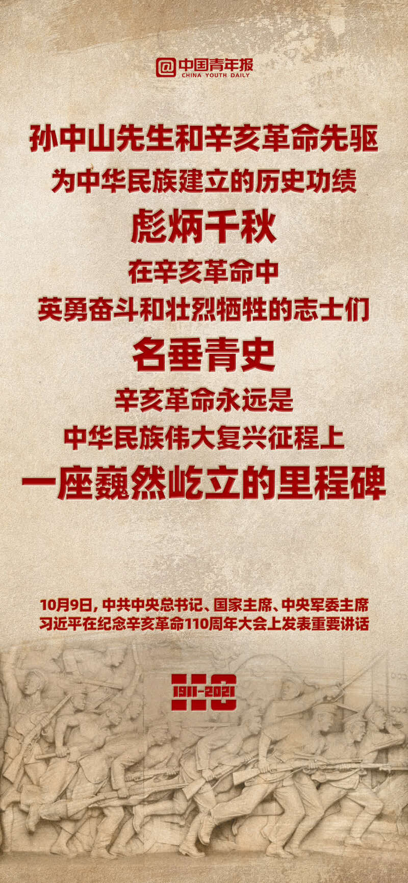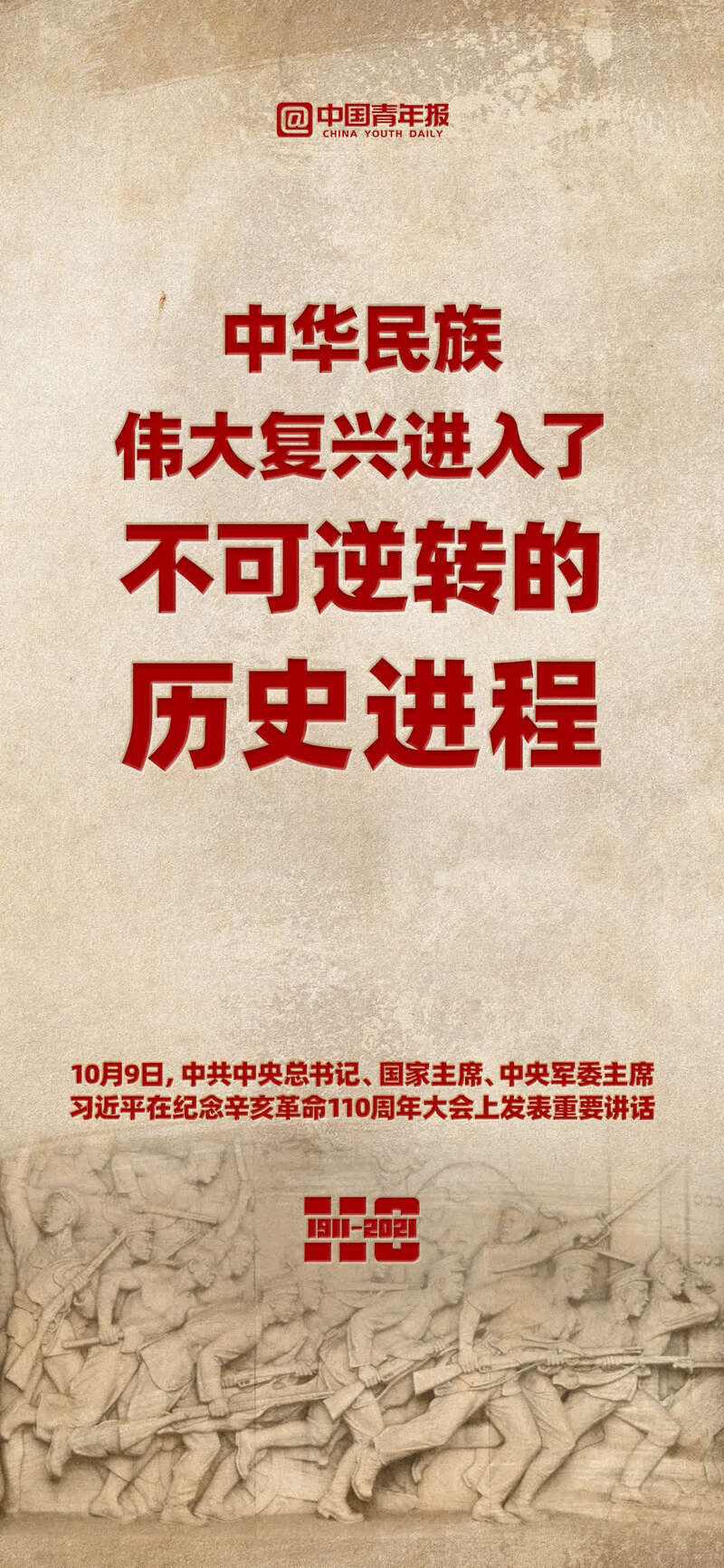 纪念辛亥革命110周年大会9日上午在北京人民大会堂隆重举行。习近平出席大会并发表重要讲话。习近平呼吁,海内外全体中华儿女更加紧密地团结起来,发扬孙中山先生等辛亥革命先驱的伟大精神,携手向着中华民族伟大复兴的目标继续奋勇前进!收藏金句,让我们为复兴伟业共同奋斗!