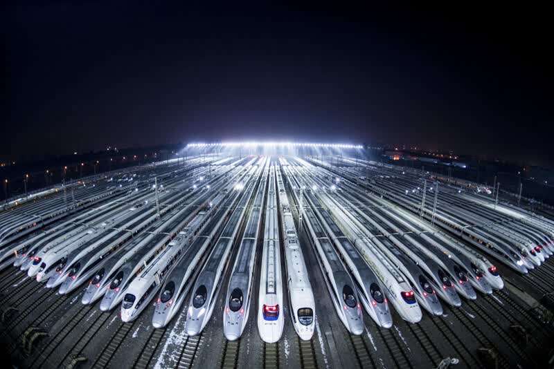 △动车组停靠在武汉动车段的存车线上,准备进行检修和保温作业(2018年2月1日摄)。