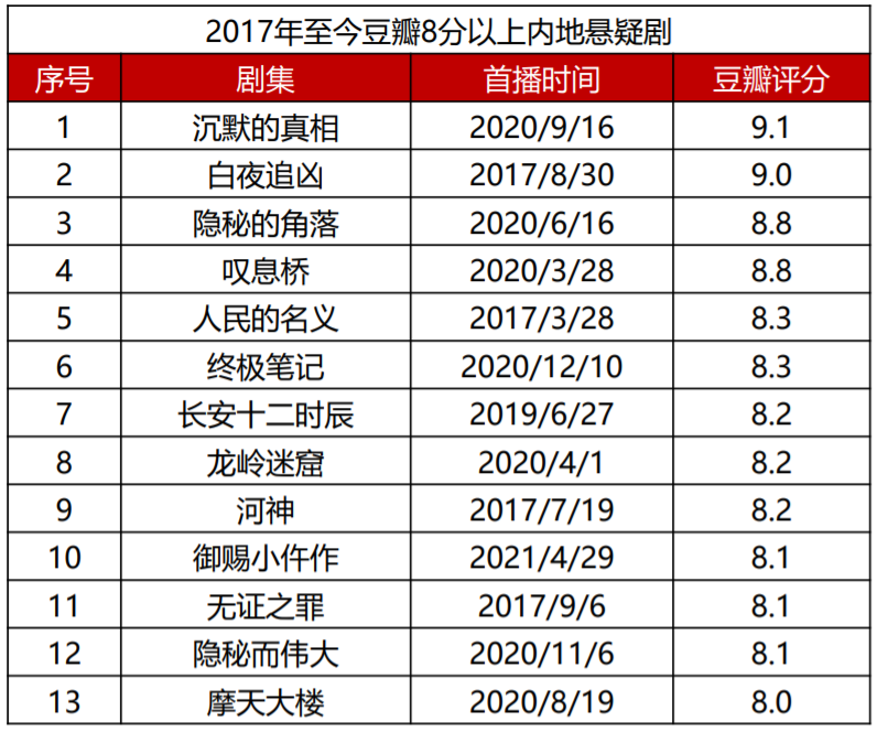 带有强烈先锋气质的高口碑悬疑剧,曾经为网剧怒刷了一波存在感。当下,悬疑剧场遍地开花,高口碑悬疑剧仍旧是视频网站打造剧集品牌的“王牌”。数据显示,从2017年至今,在剧集市场里,悬疑剧的整体数量占比仅为1%,但豆瓣评分在8分以上的高口碑剧里,悬疑剧占比却高达20%,口碑优势显著。排名第一的为9.1分的《沉默的真相》,该剧出自爱奇艺迷雾剧场。排名第二的为《白夜追凶》,是悬疑剧里兼具热度和口碑的经典之作。得益于口碑领域的优势,悬疑剧一直是受众关注度较高的领域。