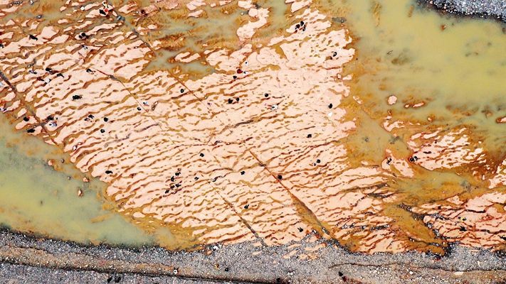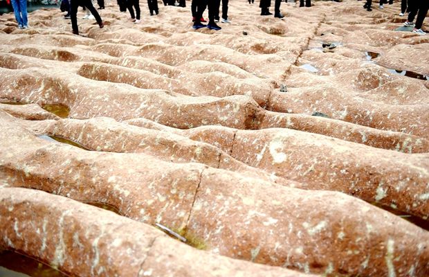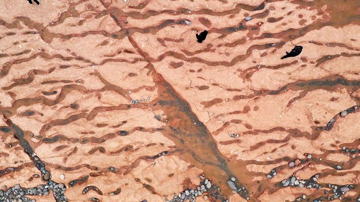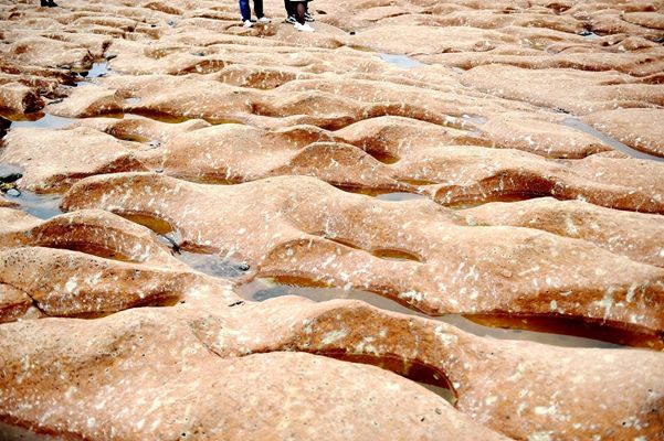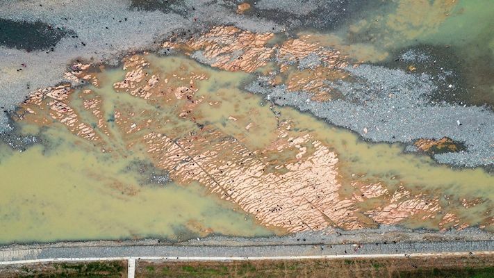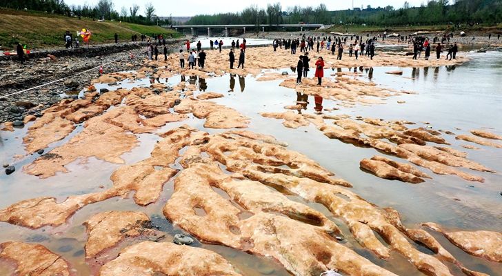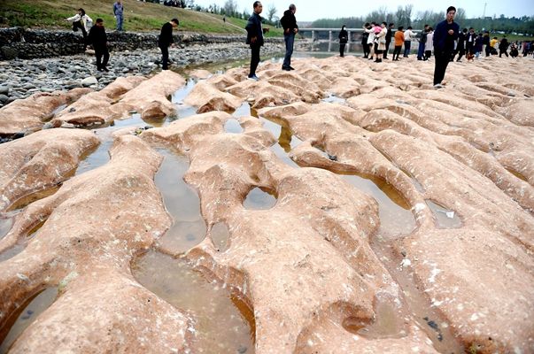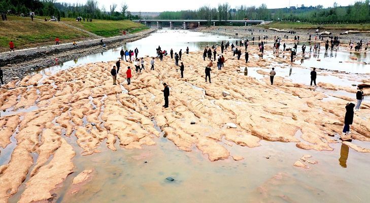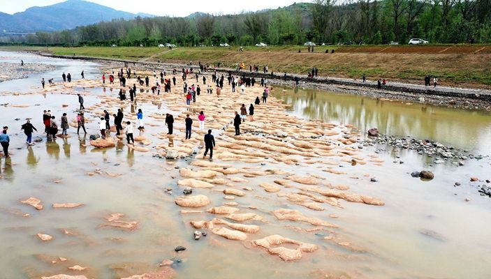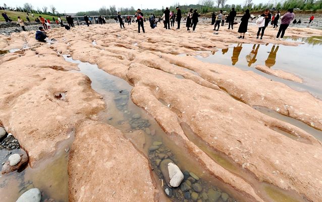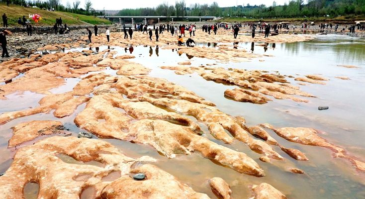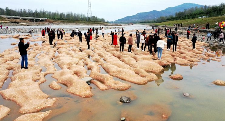2021年10月11日,河南省洛阳市伊河嵩县段河道内现大片“奇石” ,露出河面的“奇石”面积宽约70米,长约200米,石头呈浅红色,带有浅灰色圆斑,表面是冲刷形成的沟壑。