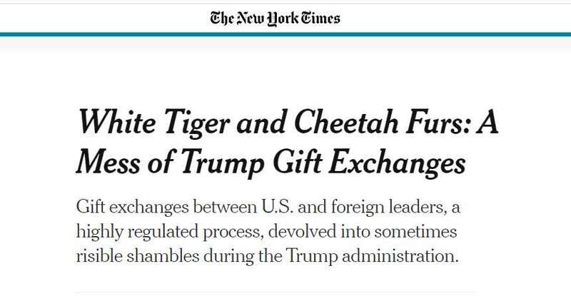 《纽约时报》称,当时,特朗普首次以总统身份出过访问。沙特王室向他赠送了80多份礼物,其中包括三件用白虎和猎豹皮毛制成的长袍以及一把握柄处似乎是象牙的匕首。