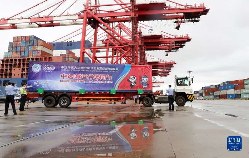 当日,第四届进博会首批海运展品在上海洋山港完成卸船吊运。这批展品搭乘中远海运2万标箱级超大型集装箱轮“天秤座”轮从德国汉堡港装船,经海运抵达上海。
