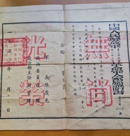 毕春艳的家中至今仍收藏着四张证书,由于年代久远,证书已经发黄破损,纸张布满了折痕,记载着其叔叔毕玉泉参军作战的经历。