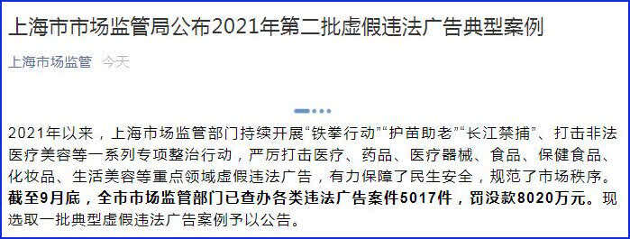 据“上海市场监管”微信公众号消息,2021年以来,上海市场监管部门持续开展“铁拳行动”“护苗助老”“长江禁捕”、打击非法医疗美容等一系列专项整治行动,严厉打击医疗、药品、医疗器械、食品、保健食品、化妆品、生活美容等重点领域虚假违法广告,有力保障了民生安全,规范了市场秩序。截至9月底,全市市场监管部门已查办各类违法广告案件5017件,罚没款8020万元。现选取一批典型虚假违法广告案例予以公告。
