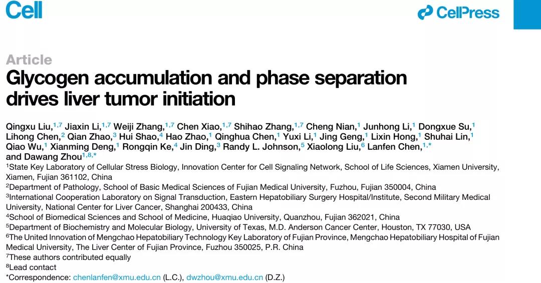 10月21日,细胞应激生物学国家重点实验室、细胞信号网络协同创新中心、厦门大学生命科学学院的周大旺和陈兰芬课题组合作在Cell杂志上发表了题为Glycogen accumulation and phase separation drives liver tumor initiation的研究论文。