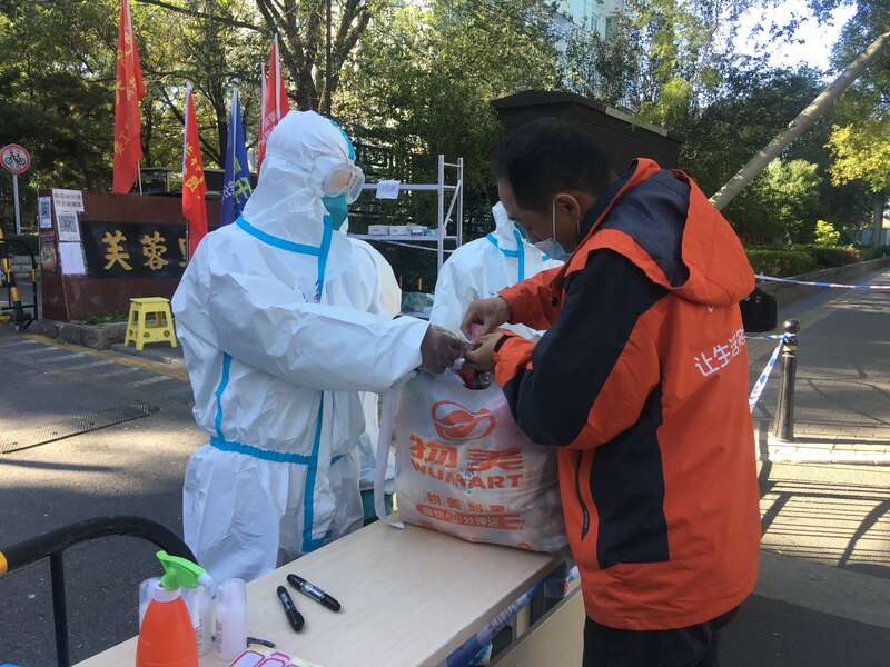 在芙蓉园社区北门,可以看到不断有快递、外卖小哥把物品在警戒线外递给穿着防护服的工作人员。工作人员在标注好货品的楼门号,进行统一消毒后,会再由其他工作人员搬运到电动三轮车上,运送到小区内各个居民楼。