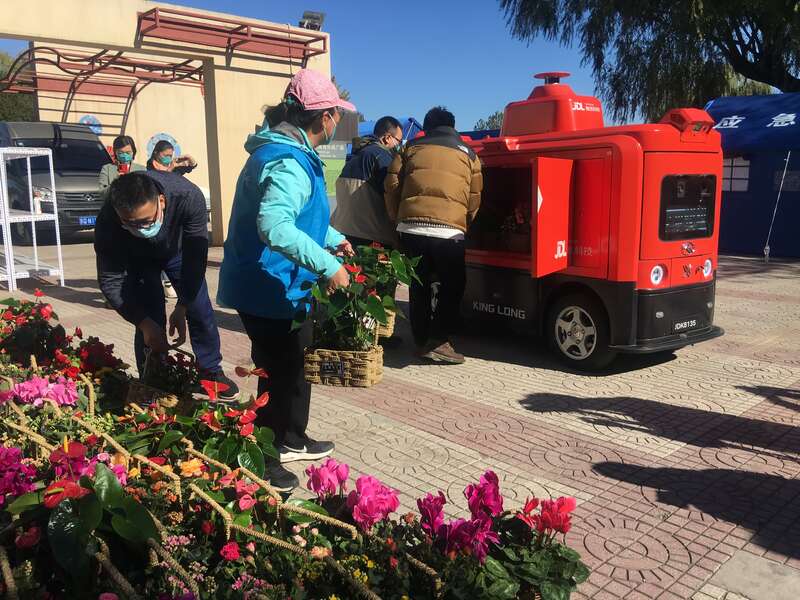 王建今天的志愿服务多了一项新任务,就是给小区外摆放的500余盆鲜花插上写着“携手同心,共抗疫情,云开‘疫’散,如约相见!”寄语的卡片,这些鲜花是海淀街道送给被隔离居民的一份礼物。而这些鲜花会由10名顺丰、中通小哥组成的“海淀街道文明小哥”志愿服务车队,以及一辆京东配送机器人,送到小区居民手中。