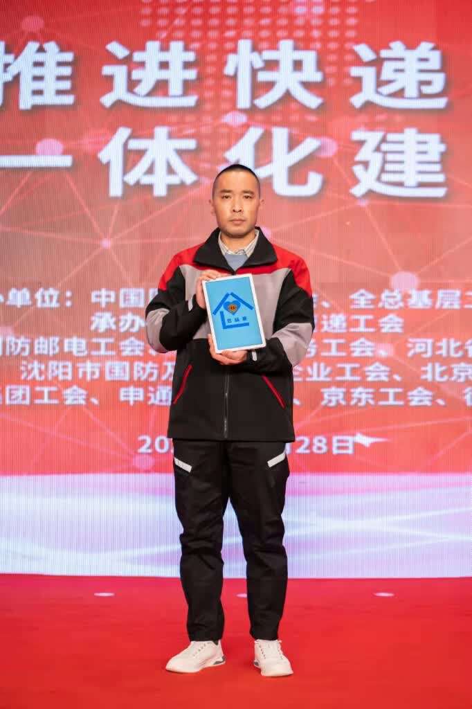 发布仪式上,标识设计一等奖获得者、快递员马靖斌展示他设计的作品。