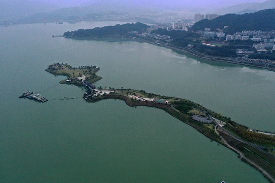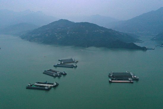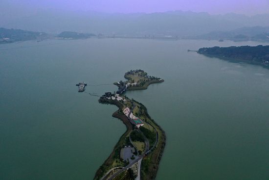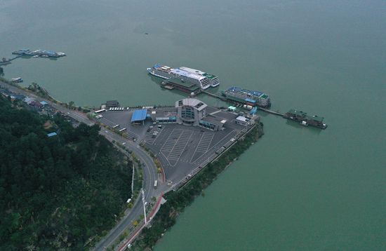 2021年10月27日,湖北宜昌秭归县茅坪镇,水位上涨后三峡水库(无人机照片)。当日18时,三峡水库水位涨至174.33米,这标志着三峡工程2021年175米蓄水进入最后冲刺阶段。按照计划,三峡水库水位将在本月底或11月涨至175米。