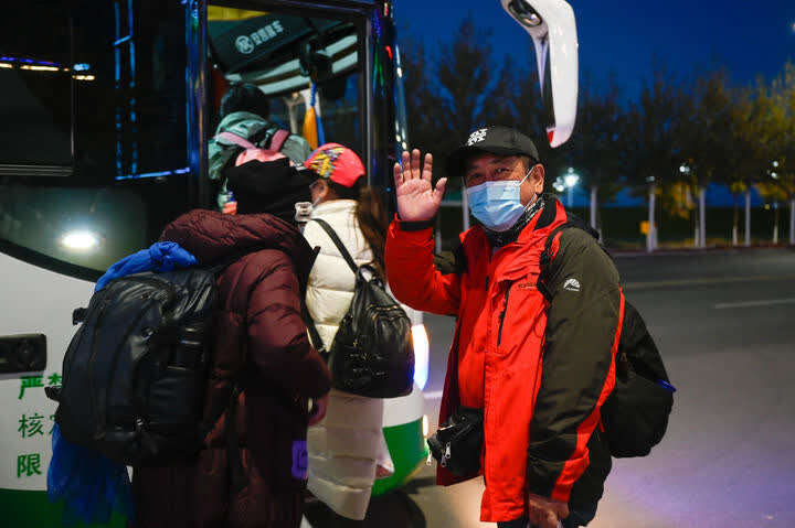 滞留游客在登上大巴车前挥手道别。新华社记者 贺书琛 摄