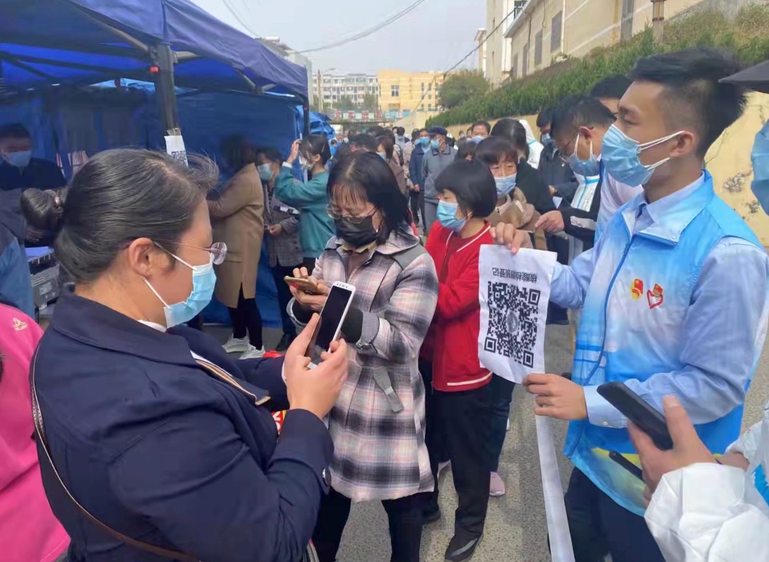 “请大家不要着急,保持间隔距离,如果遇到扫码或检测的任何问题,直接找我们志愿者,穿蓝马甲的,有这个标识的。”志愿者彭肇辉指着身上的团徽对前来进行核酸检测的群众们说。