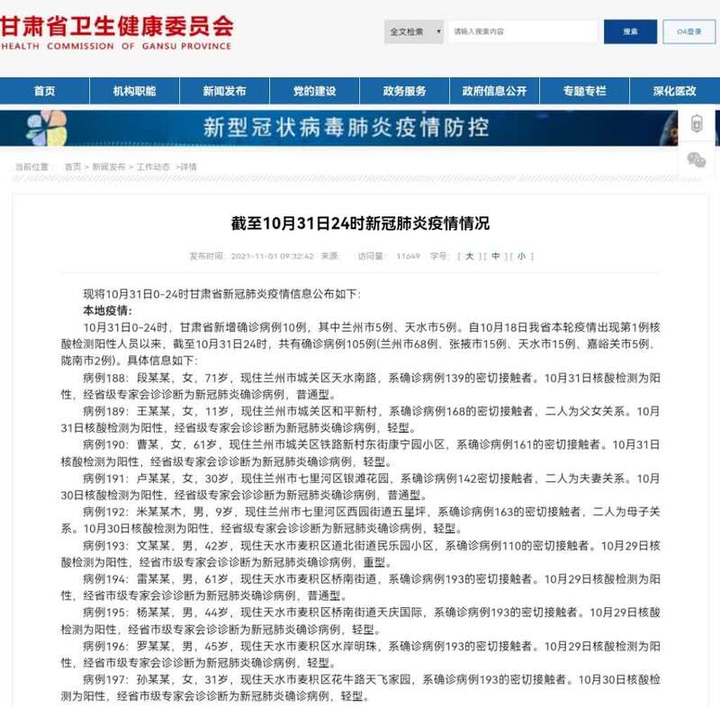 病例193:文某某,男,42岁,现住天水市麦积区道北街道民乐园小区,系确诊病例110的密切接触者。10月29日核酸检测为阳性,经省市级专家会诊诊断为新冠肺炎确诊病例,重型。
