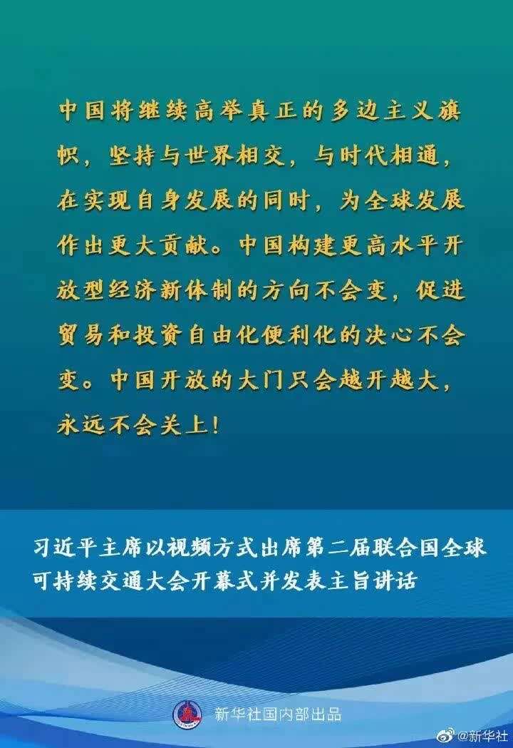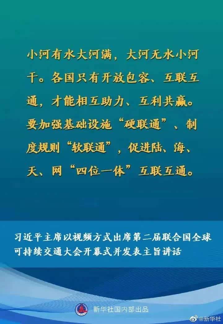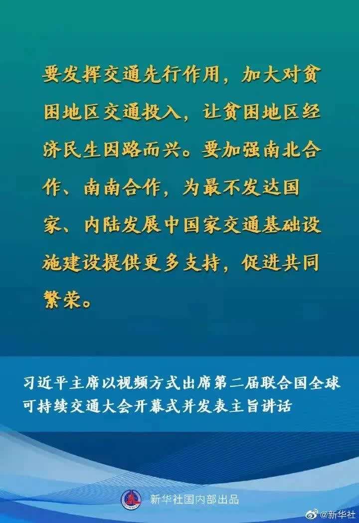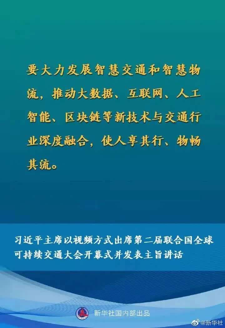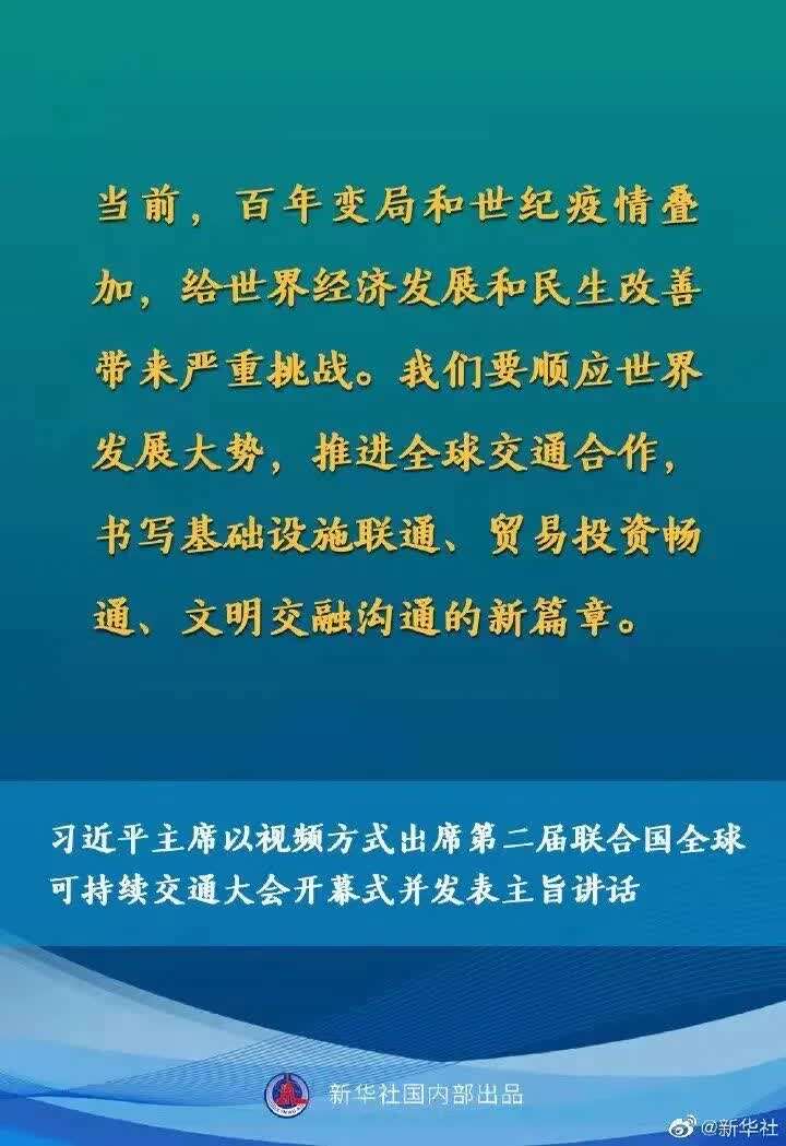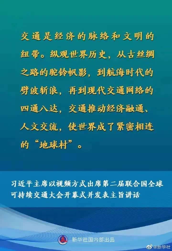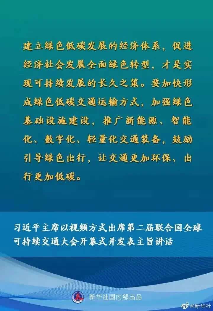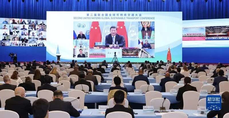 10月14日晚,国家主席习近平以视频方式出席第二届联合国全球可持续交通大会开幕式并发表题为《与世界相交 与时代相通 在可持续发展道路上阔步前行》的主旨讲话,提出重要倡议、宣布务实举措、体现中国担当,为推进全球可持续交通事业发展注入强大动力和坚强信心。