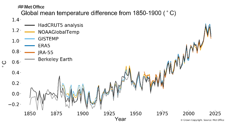 世界气象组织声称,“创纪录的”大气温室气体浓度和热量积累已经将地球“推向未知的领域”,并将对今世和后代“产生深远的影响”。据报告统计数据显示,2021年全球平均气温(1月至9月)较1850至1900年高出约1.09摄氏度,目前被世界气象组织列为全球有记录以来第六个或第七个最温暖的年份。该报告称,2020年全球温室气体浓度已达到新高,二氧化碳、甲烷和氧化亚氮的浓度分别比工业化前高出149%、262%和123%,而这种增长在2021年仍在继续。