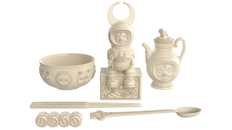 张诗浩是一位80后综合媒介艺术家,此次设计的这套潮玩,灵感来自备受年轻人喜爱的明日深渊系列IP,有宇航员和电子狗的形象,保持了定瓷传统器型之美的同时,融合了潮流元素。