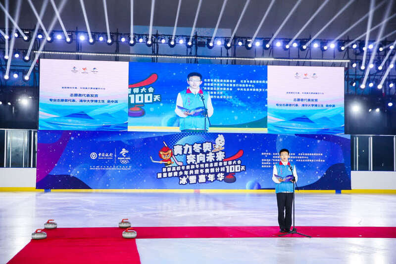 10月26日,首都高校冬奥和冬残奥志愿者誓师大会在京举行,清华大学志愿者代表余中淇在活动中发表感言。新华社记者陈钟昊摄