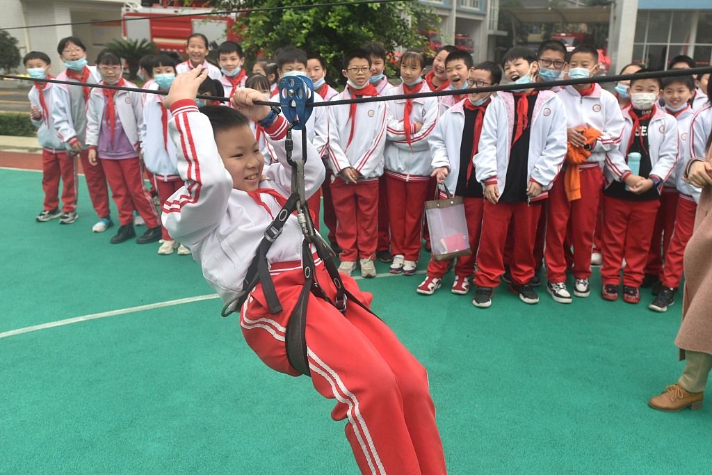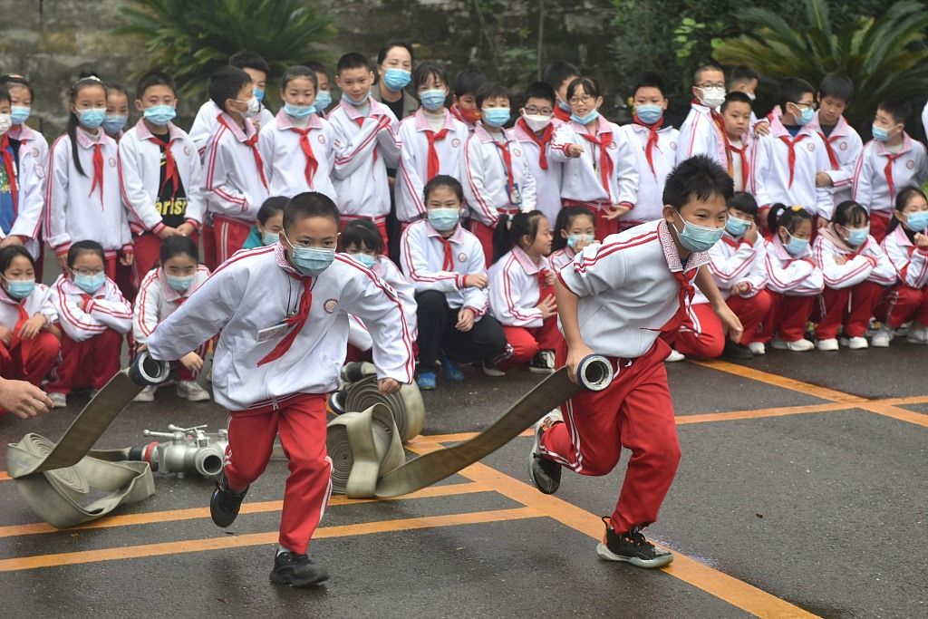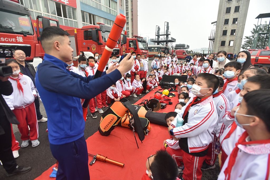 2021年11月4日,四川省内江市消防救援支队特勤消防站,孩子们在参观体验消防器材装备。