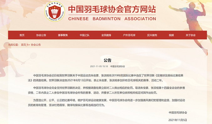 中国青年报客户端讯(中青报·中青网记者慈鑫)中国羽毛球协会官方网站11月5日下午公告,表示支持世界羽联于今年8月13日作出的对中国羽毛球运动员朱俊豪、张滨榕禁赛两年的处罚,朱俊豪、张滨榕违反了世界羽联《反赌球及操纵比赛结果法》。