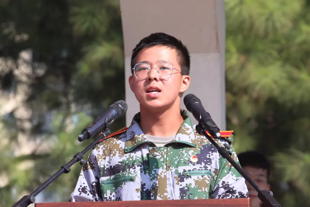 一阵风轻轻吹来,抚慰了他紧张的心,他知道自己的家人正在台下陪伴着自己,心情也就轻松了起来。他也笑着和记者说到:“幸好军训服的裤子比较宽大,才没有让大家发现我有一些紧张。”两年前的9月18日,黄信博也作为代表在高中学校作了演讲;两年后的9月18日,黄信博又一次地站上了发言台,这就是一场穿越时空的对话。
