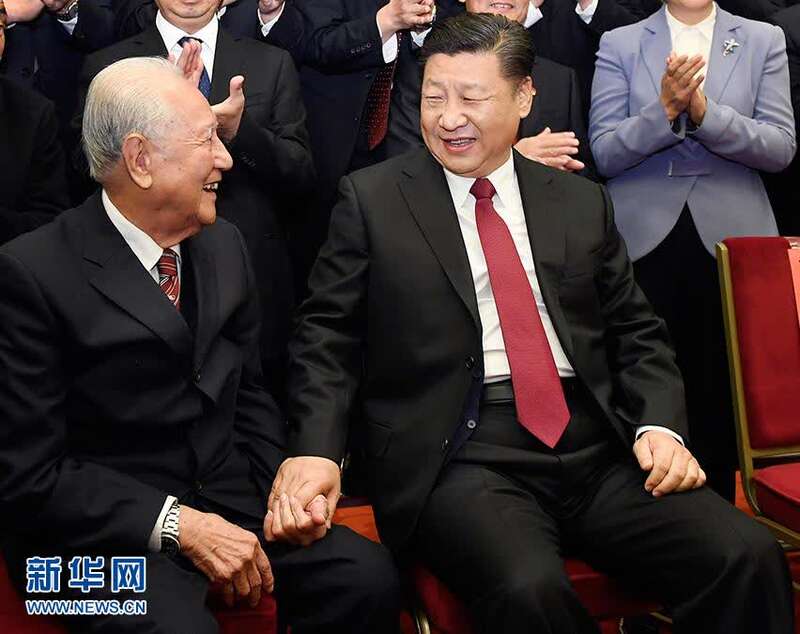2017年11月17日,全国精神文明建设表彰大会在北京人民大会堂举行。会前,习近平、王沪宁等会见与会代表。这是习近平邀请黄旭华、黄大发代表坐在自己身边合影。新华社记者 李学仁 摄