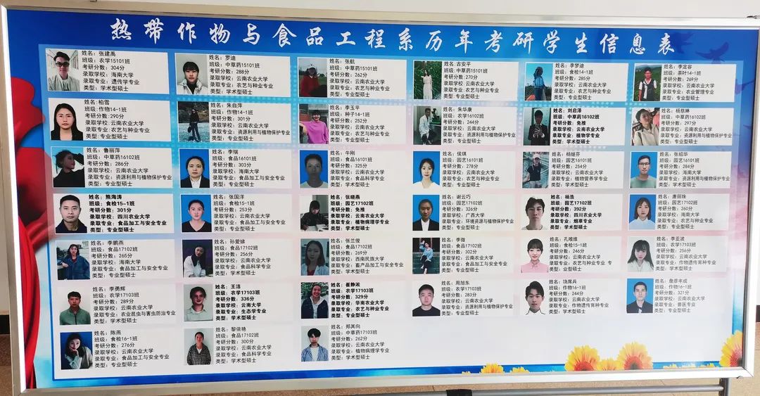 今年热带作物学院热带作物与食品工程系2017级园艺、食品科学与工程 两个班共有16人报名考研,9名同学考上研究生 , 其中1人获保研资格,1人以392分考入四川农业大学烟草专业,其余同学分别被海南大学、广西大学、西南民族大学和云南农业大学录取,上线率56.25%。