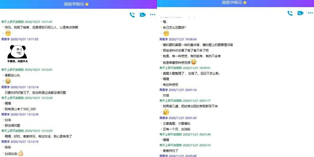 考前一个月,有同学说:自己考研压力太大,有焦虑、想放弃的想法。辅导员多次走访宿舍,给学生心理疏导,陪学生聊天、为学生加油打气,告诫他们:在考研复习期间,最可贵的是坚持,最难的也是坚持。一定要脚踏实地,制定自己的学习计划,不要和别人比进度,但也要跟上进度,选择与努力同等重要。当你回过头看自己走的路,其实也没那么难,都是坚持和信念一直在,曾经所有的困难都会随着日子过去。