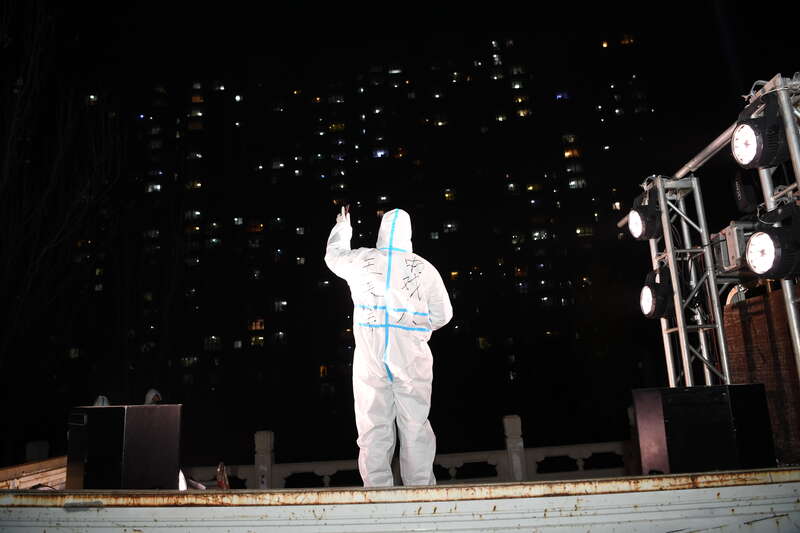 皇甫晓朋是“戏剧之城”文旅艺术区的运营总监。作为中央戏剧学院2018年的毕业生,自从10月22日小区封控以来,他和不少来自中戏的学生组成了一支志愿者队伍,白天帮居民跑腿、运送物资,晚上,办起了简易“音乐会”,11月3日、4日和6日,在宏福苑社区一共举办了6场。