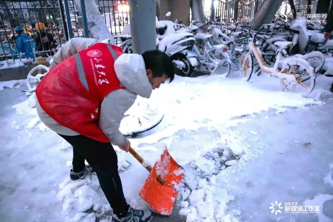 11月7日,受强冷空气影响,济南市降温、大风、大雪齐上阵,山东大学校园内道路积雪结冰严重。为清理积雪、方便师生出行,山东大学第一时间发布《关于动员广大青年积极参加校园扫雪除冰的倡议》,全校师生立刻积极投入到扫雪除冰工作。
