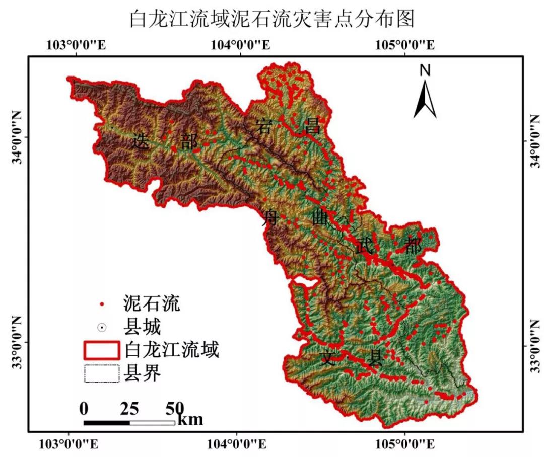 团队研究并梳理前人成果发现,白龙江流域泥石流主要是暴雨型泥石流,是我国泥石流分布密集区之一,有危害性的泥石流沟多达765条,滑坡处有433处。影响灾害发生的主要原因有三:暴雨是诱发泥石流的决定性因素,每年汛期,上游多属阵性暴雨,中游少雨,下游雨量大、强度高、次数多;地层岩性也与泥石流的发生有必然联系,江北岸岩层软弱,因此泥石流沟较南岸更多;道路建设、垦荒造地、人类不合理居住、水利建设等人类活动因素也产生了一定的影响。