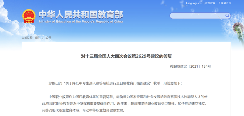 中国青年报客户端北京11月11日电(中青报·中青网见习记者 杨洁)记者今天从教育部官网获悉,教育部在答复十三届全国人大四次会议第2629号建议“关于降低中专生进入高等院校进行全日制教育门槛的建议”时表示,为进一步强化中等职业教育基础作用,规范长学制技术技能人才贯通培养,严格执行技能拔尖人才免试入学条件,教育部将逐步建立“职教高考”制度,使中职毕业生享有更多样的教育选择和更畅通的学业提升通道。