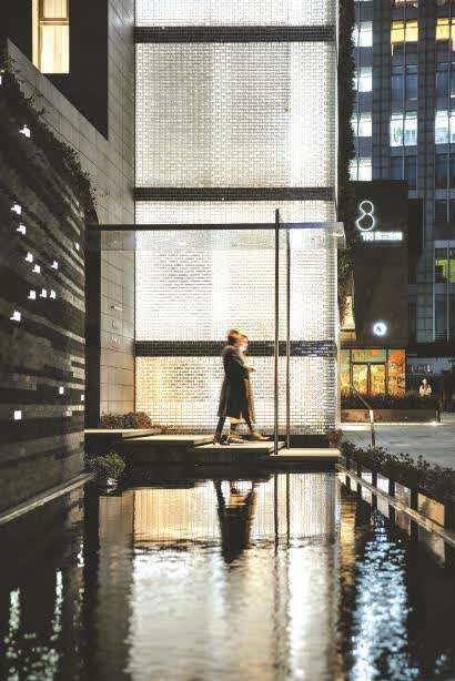 在看得见的地方,黑石公寓高大的体量和折中主义外观是整个街区的核心,周边的商业建筑以谦虚的造型、通透的立面构造和深色的石材外饰面拱卫着主体建筑。通透的立面是为了过滤光线。从音乐厅听完音乐会的人来到这里,是从视觉紧张兴奋的辉煌殿堂走进阑珊夜色,建筑立面的疏朗格栅、阳台栏杆、磨砂玻璃砖让光线变得柔和,眼睛放松的同时,身心也会松弛。深色的建筑石材饰面则可以让庭院中的榉树叶在白天更显葱翠,可以较好地缓解视觉的疲劳感。正是这些理念造就了建筑看不见的和谐。