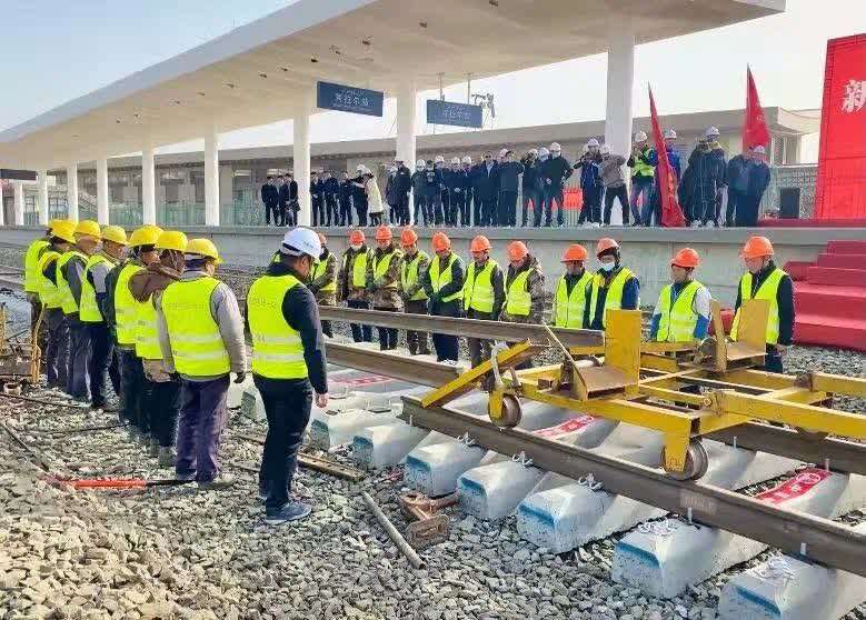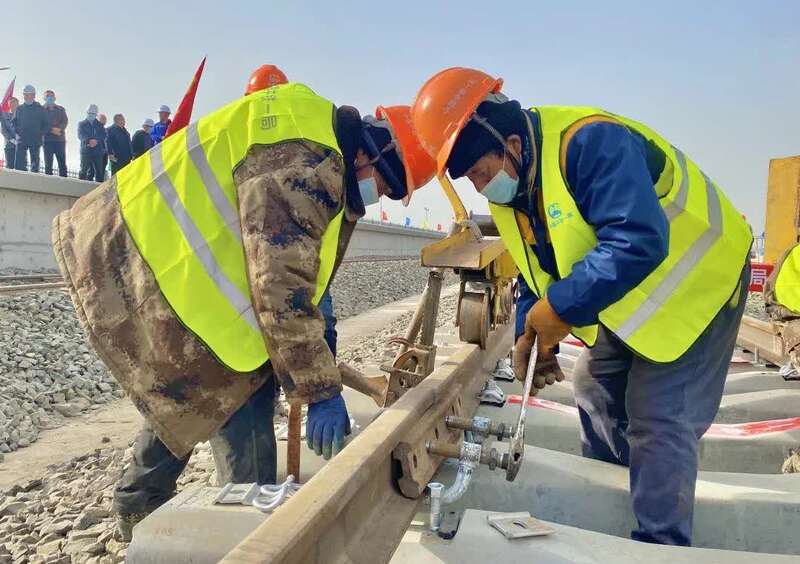 铁路建设者采取倒排计划、咬定施工节点,在确保安全的基础上,实现了单日最高5公里的铺轨进度。