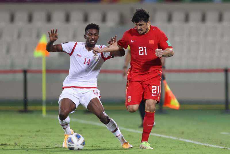 洛国富(右)与阿曼队球员艾哈迈德·哈米西在比赛中拼抢。新华社发