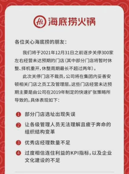 无独有偶,11月5日,曾经红透餐饮界的海底捞发布公告称,将于2021年12月31日前逐步关停300家左右经营未达预期门店。而和这种关店速度相呼应的是,疫情暴发之后,海底捞却加速扩张,2020年新开了544家门店,比2019年新开门店数大幅增长了近8成,2021年上半年继续高歌猛进,新开了299家。