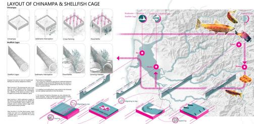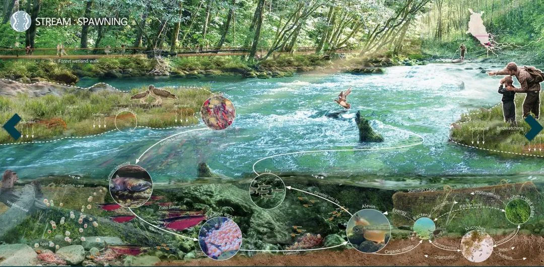 在这个项目中,小组成员通过鲑鱼洄游路线的三个阶段重建鲑鱼的栖息地连通性,寻求了一种与潜在的与洪水共生的生活方式,而不是传统的抵御为主。赛后,小组成员刘畅感叹:“本科时期,对风景园林的理解,仅仅是户外景观或者公园。通过国际竞赛,我们意识到景观的功能不仅是传统的休闲娱乐,还能为全球的环境问题提供可持续、动态发展、顺应自然的新途径。”