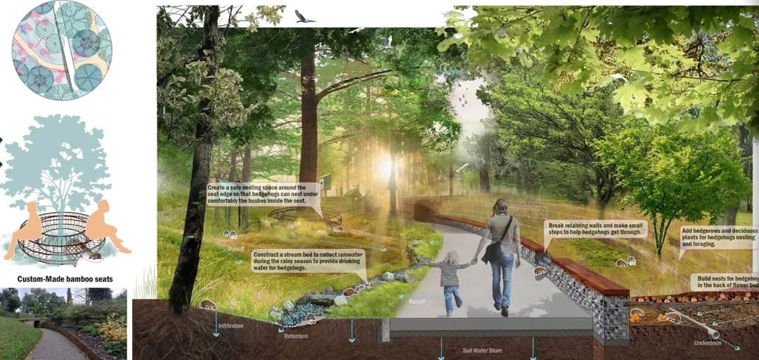 “在老师的指导下,我们根据刺猬的生命周期进行了空间分类,做出能够满足人和刺猬共同需求的景观化城市设计。比如我们设计了一种竹制座椅,下方特意设计了适合刺猬通过或藏身的通道,从动物角度来设计改造人居环境。我们白天各自画图,在结束一天的课程后聚到一起互相提供修改意见,”张晨悦同学回忆一起熬夜做项目的时光,“大家都朝着同一个目标在努力,虽然辛苦,但很快乐。”
