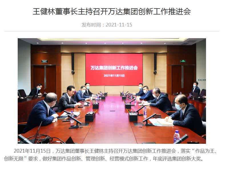 日前,67岁的万达集团董事长王健林被传于11月4日下午病逝,对此,万达集团官网直接发布一则王健林主持召开集团高层会议的照片,力破谣言。消息显示,11月15日,万达集团董事长王健林主持召开万达集团创新工作推进会,落实“作品为王、创新无限”要求,做好集团作品创新、管理创新、经营模式创新工作,年底评选集团创新大奖。