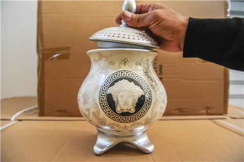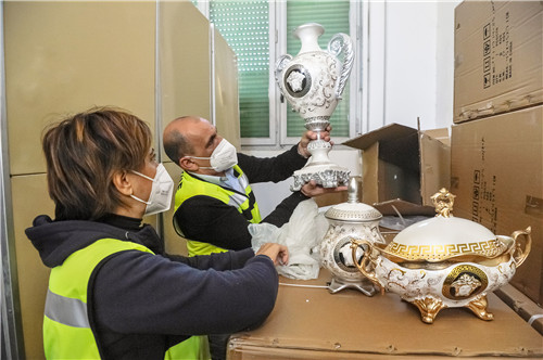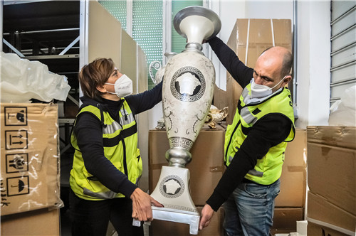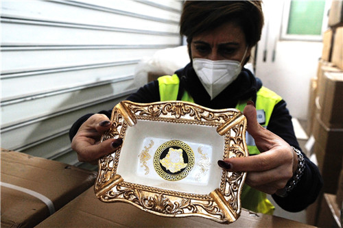 当地时间2021年11月18日,意大利里窝那,当地海关缴获了超过900件印有范思哲品牌标识的奢侈品家具假货,包括花瓶、桌子、烟灰缸等等。