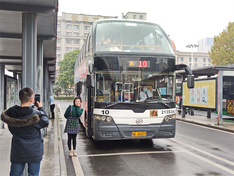 2021年11月20日,武汉,有许多市民和家长闻讯后,陪伴小孩顶风冒雨来到汉口火车站站前广场,依依不舍乘坐了由汉口火车站开往武昌火车站的10路双层公交车,同他们一起观赏公交沿线最美的城市风貌,从小留下终身难忘的历史回忆。