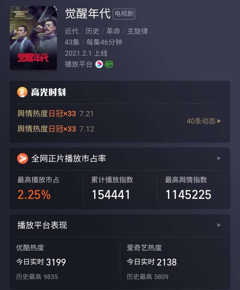 灯塔专业版负责人分析:一,《觉醒年代》热播周期比较长,但单天的爆发力并不强,属于细水长流型;二,上映同期还有《赘婿》等爆发比较高的剧,竞争激烈;三,《觉醒年代》是上星剧,播放渠道有分流,而通过灯塔专业版电视收视数据来看,该剧在收视方面的关注度和市占率排在第一位。“随着播出平台的多元,一部剧的热度会受多种因素影响,不能单看一个数字的结果,每部剧的情况都可能不一样,需要根据多个数据综合考量。”