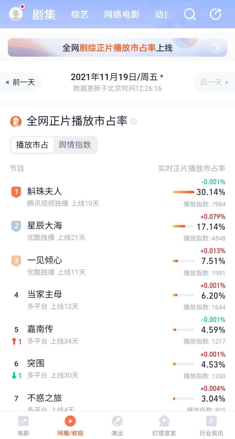按照灯塔专业版统计,11月19日播放市占最高的剧为《斛珠夫人》(29.40%),其次为《星辰大海》(17.64%)。在综艺领域,排在前两位的则是《令人心动的offer》第三季(23.31%)和《导演请指教》(10.20%)。