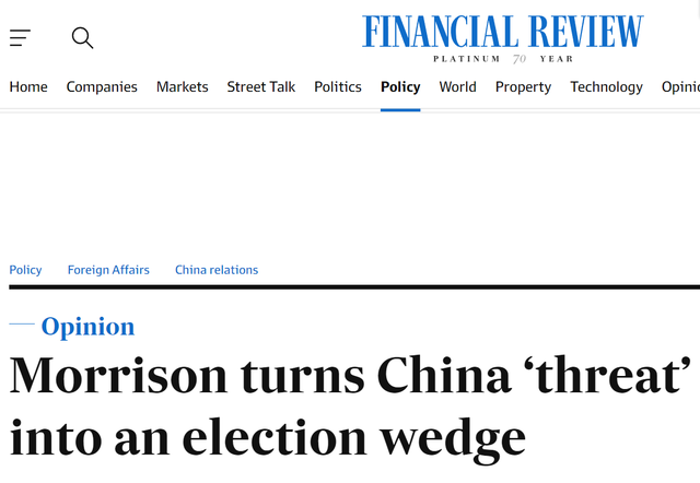 【环球网报道 记者 张晓雅】“莫里森把中国‘威胁’变成了选举的楔子。”《澳大利亚金融评论》21日的评论文章一针见血。