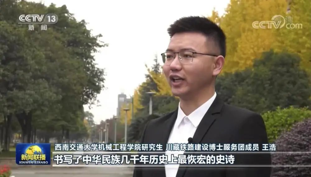 11月18日晚,中央电视台《新闻联播》节目播出题为《党的十九届六中全会在广大青年中引起热烈反响》的报道,西南交通大学机械工程学院研究生、川藏铁路建设博士服务团成员王浩接受采访并发表感想。