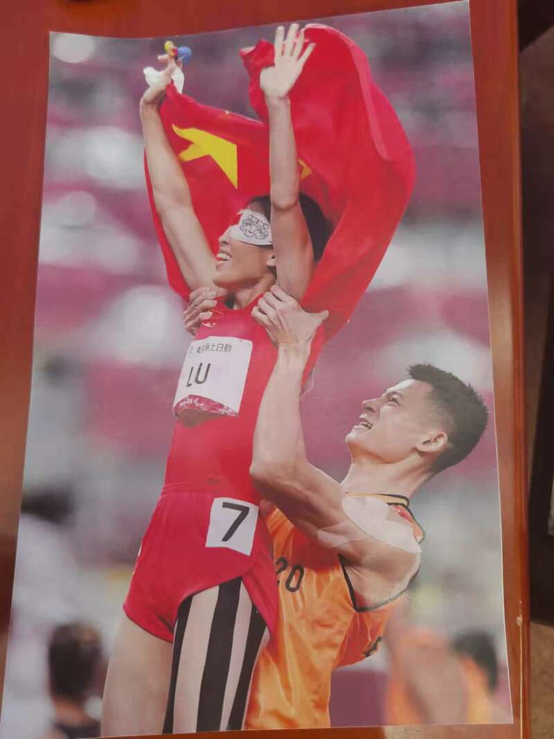 中国青年报客户端北京11月26日电(中青报·中青网记者 郭剑文/摄)盲人短跑运动员刘翠青的领跑员徐冬林,今天向记者展示了一张照片:徐冬林将东京残奥会田径女子200米T11级决赛中夺冠的刘翠青高高举起。