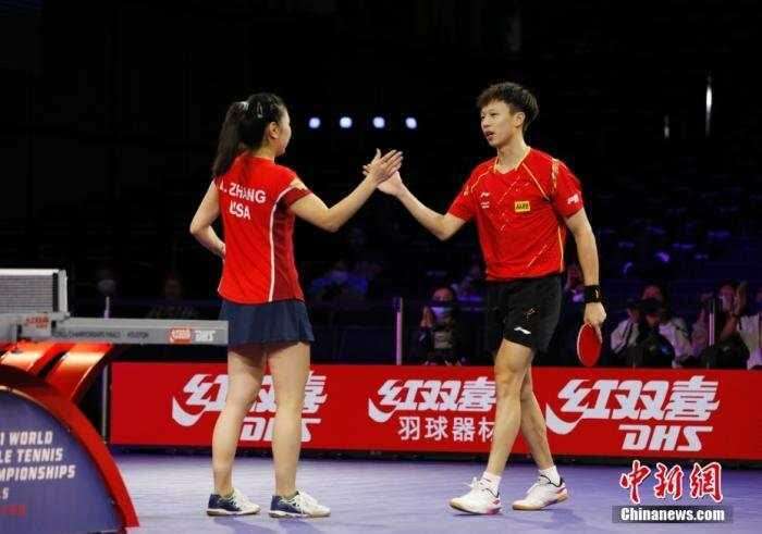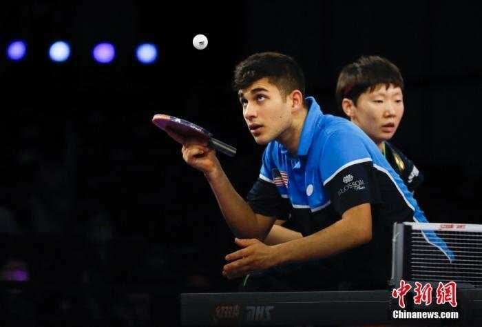 当地时间11月25日,王曼昱(右)和卡纳克在比赛中。当日,在美国休斯敦举行的2021世界乒乓球锦标赛混合双打比赛中,中美两对跨国组合林高远(中国)/张安(美国)和卡纳克(美国)/王曼昱(中国)战胜各自对手,携手晋级16强。中新社记者 刘关关 摄