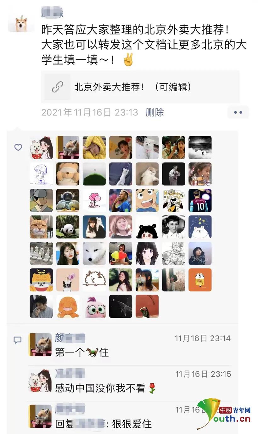 11月16日晚上,顾淼便在自己的朋友圈发布了这个《北京外卖大推荐》金山文档。一时间,不少同学和朋友给她点赞并留言。