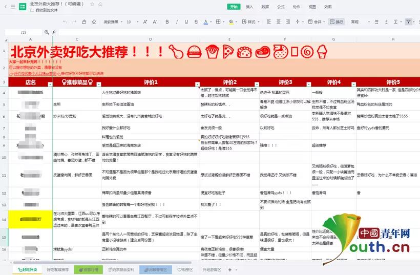 记者还注意到,这段时间内,每天从清晨到凌晨,不断有学生进行编辑,对餐馆进行点评,分享自己的“试吃”经验。有参与编辑的网友还对文档进行了美化,文档名称和栏目名称中还加上了汉堡包、薯条、冰激凌等表情包符号,让文档更显“外卖”和“吃货”特色。