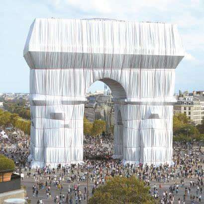 法国地标建筑、戴高乐广场中央的凯旋门整个被2.5万平方米银蓝相间的可回收织物包裹,再由3000米红绳扎紧,从而构成一件名为《凯旋门,打包》的艺术作品。